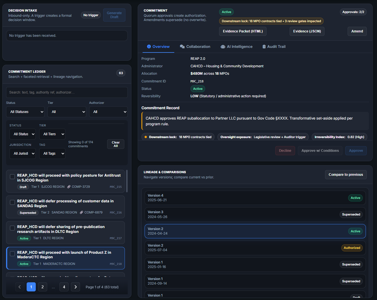 Every AI-driven action is recorded as a structured institutional commitment, anchored to defined authority and scope.